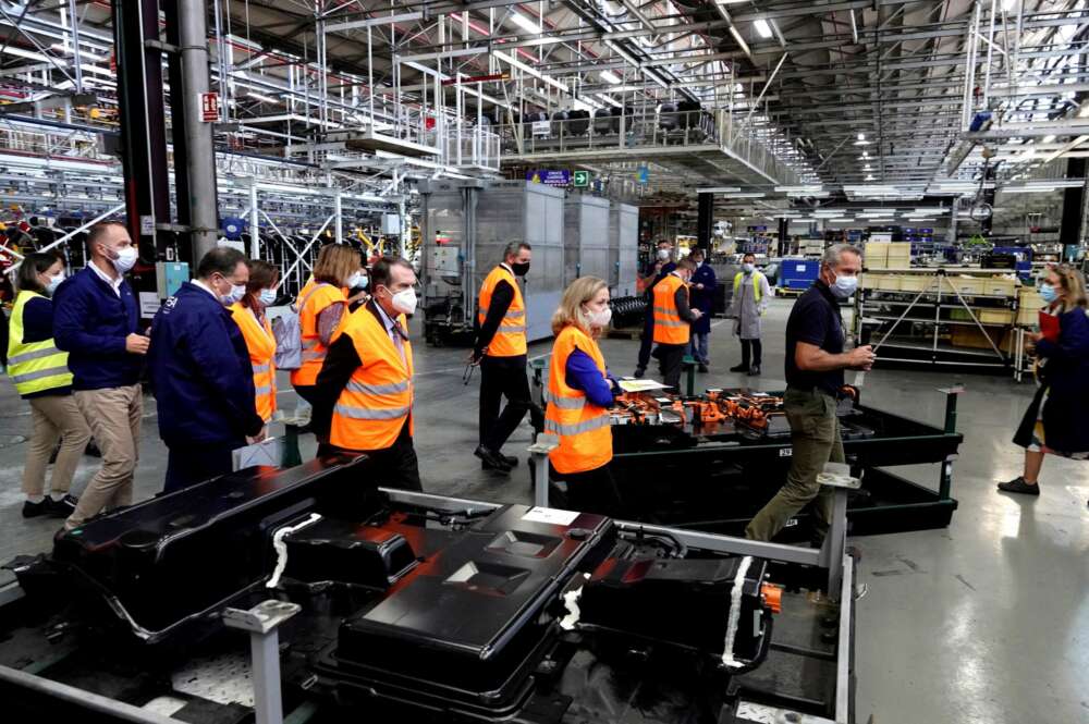La vicepresidenta del Gobierno Nadia Calviño (c), visita la sede del grupo automovilístico Stellantis en Vigo, acompañada del alcalde Abel Caballero (2i) y el director de la factoría Ignacio Bueno (i). EFE / Salvador Sas