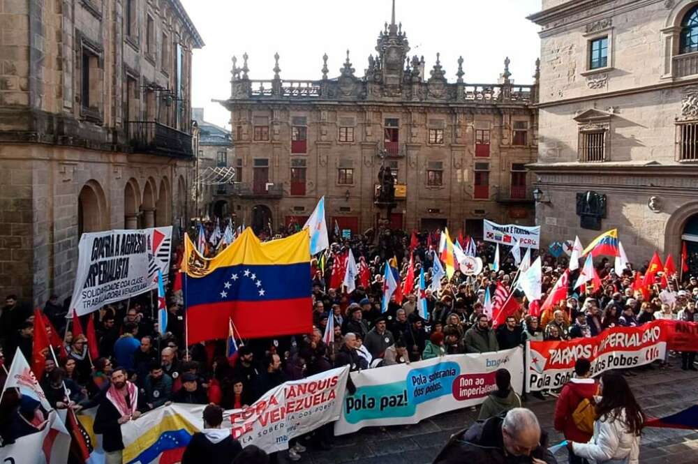 Más de mil personas se han manifestado este sábado, 10 de enero, en Santiago de Compostela contra el «imperialismo yanqui» y por la «paz y soberanía» de Venezuela. Convocada por la Asociación Galego-bolivariana Hugo Chávez (Agabo), la concentración fue secundada por sindicatos, asociaciones y formaciones políticas.