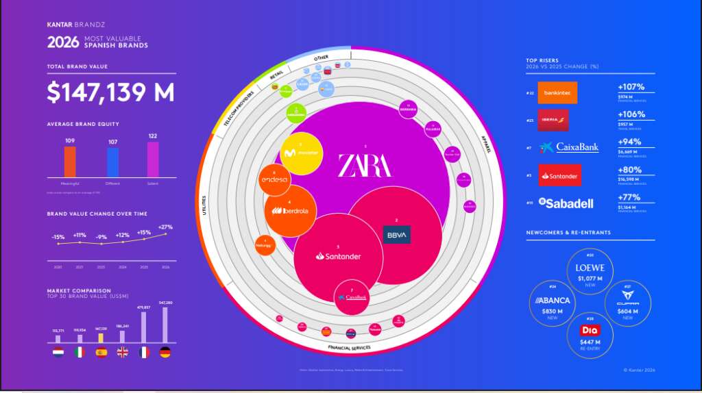Junto al buque insignia de Inditex, BBVA y Santander completan el pódium de las marcas españolas más valiosas. El ranking destaca de Zara su dominio en el sector, su autoridad en la moda y su capacidad constante para cumplir con las expectativas del consumidor, impulsan su posición tanto en precios como en diferenciación.