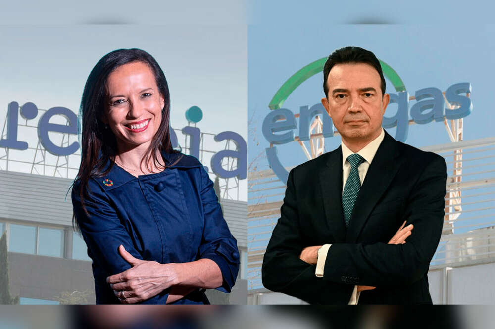 Beatriz Corredo, presidenta de Redeia, y Arturo Gonzalo, consejero delegado de Enagás, las dos grandes apuestas inversoras de Amancio Ortega en la bolsa española al margen de Inditex. Montaje: Pablo Ares Heres