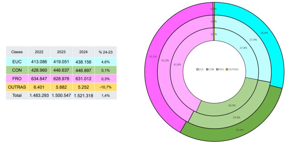 Los datos del Inventario Forestal Continuo de Galicia muestran que la superficie de eucalipto en el monte gallego se incrementó en 25.000 hectáreas entre 2022 y 2024 pese al veto de la Xunta; las coníferas se expanden de forma mucho más moderada y las frondosas retroceden