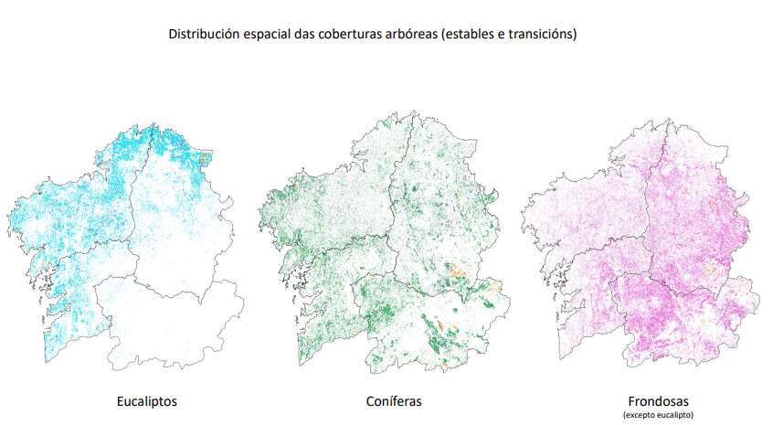 El Inventario Forestal Continuo fue una de las herramientas que impulsó la Xunta tras los mortales incendios de 2017 en colaboración con la Universidade de Vigo y la Universidade de Santiago. El último mapeado muestra un avance del 4,6% en la superficie de eucalipto frente al 0,1% de las coníferas y del 0,3% de las frondosas. Todas suben, lo que muestra una mayor superficie forestal en el conjunto de la comunidad, aunque lo hacen a distinto ritmo y con una clara tendencia en cuanto a especies.