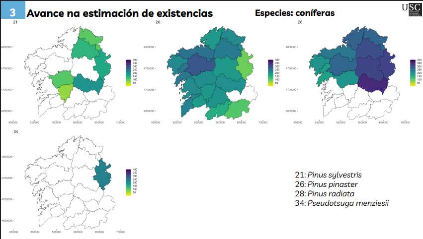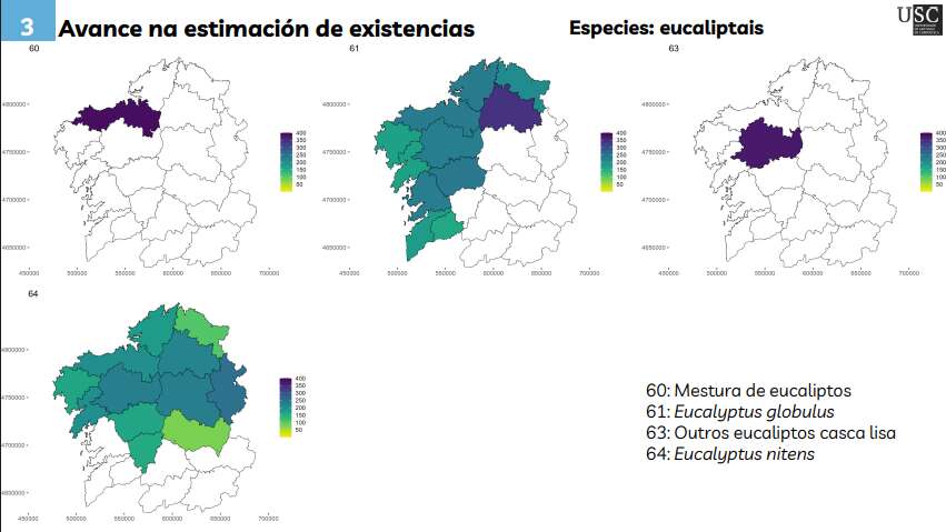 Más resbaladizos son los resultados de estimación de existencias, pues se trata todavía de un proyecto en desarrollo. Los datos más fiables son los del eucalipto, pues al emprender el mapeado de norte a sur se ha incorporado un mayor porcentaje de esta especie que de las coníferas o frondosas. Aún así, las existencias medias recogidas hasta el momento conllevan un cierto grado de incertidumbre.
