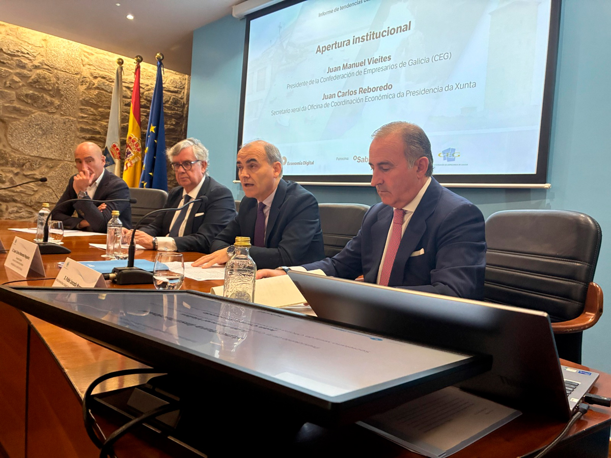 Foto de grupo de los participantes en la presentación. De izquierda a derecha, el director de Economía Digital Galicia, Julián Rodríguez; el secretario xeral de la Oficina de Coordinación Económica de la Presidencia de la Xunta de Galicia, Juan Carlos Reboredo; el presidente de la Confederación de Empresarios de Galicia, Juan Manuel Vieites; el socio director en FINANZIA Fintech y colaborador de Economía Digital Galicia, Manuel Carneiro; y el director general del Sabadell Gallego y director general adjunto de Banco Sabadell, Pablo Junceda / Luis Acebal