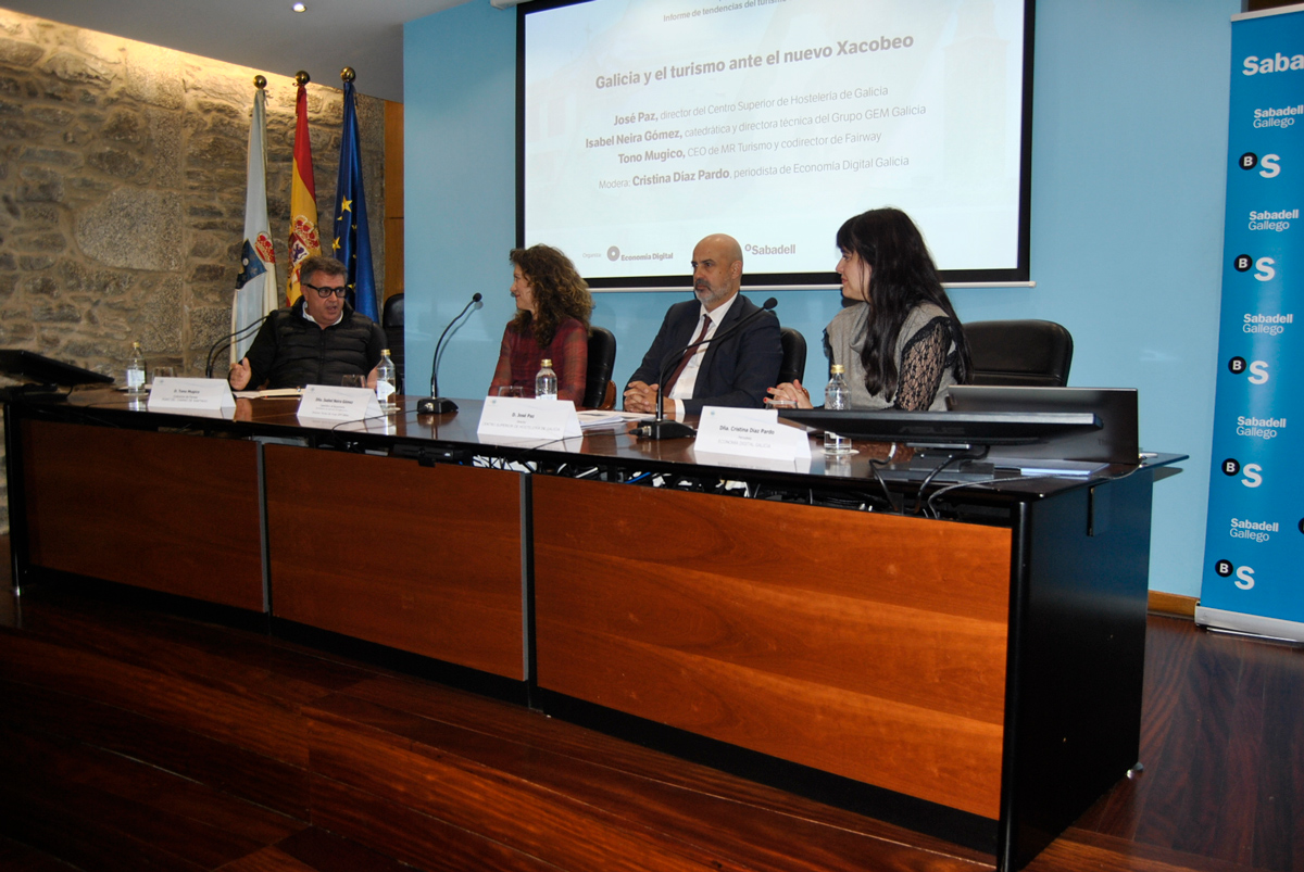 De izquierda a derecha, Tono Mugico, CEO de Mr Turismo y co director de Fairway; Isabel Neira Gómez, catedrática de la USC; y José Paz, director del Centro Superior de Hostelería de Galicia, participan en la primera de las mesas moderada por Cristina Díaz Pardo, periodista de Economía Digital Galicia / Pablo Ares Heres