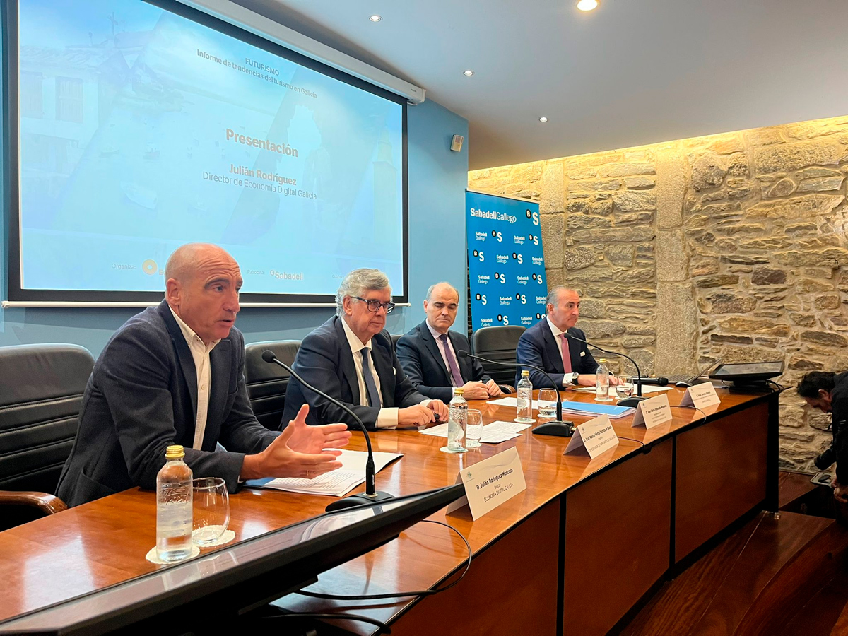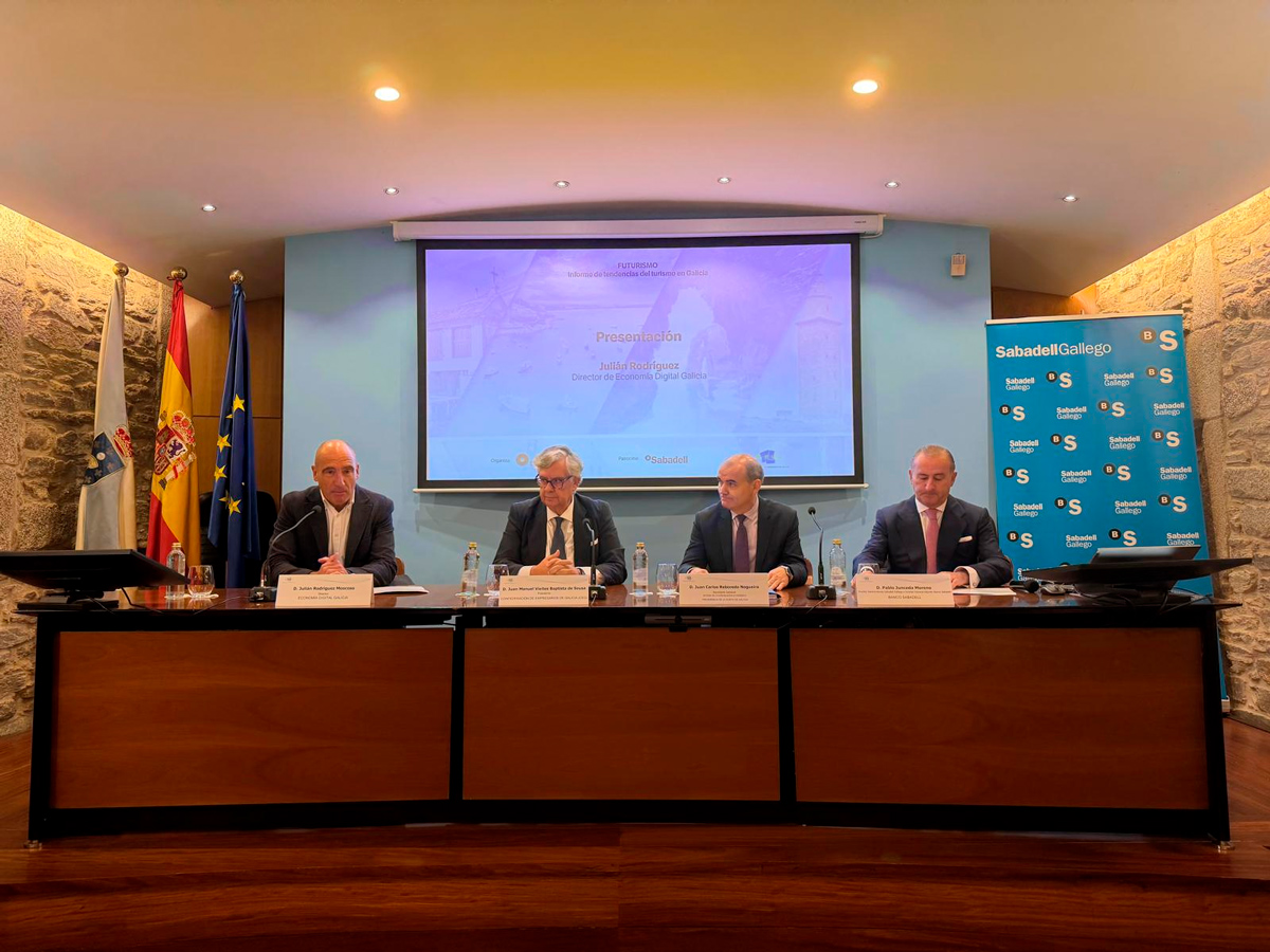 En la segunda fila, de izquierda a derecha, José María Cortés Alonso, director de negocio turístico de Banco Sabadell; Silvia Rumbo Bouso, directora de medios de pago & eCommerce de Banco Sabadell; Ramón Rama, director comercial de Dimensiona; y Juanjo Manso, director de GFM Ideas / Pablo Ares Heres