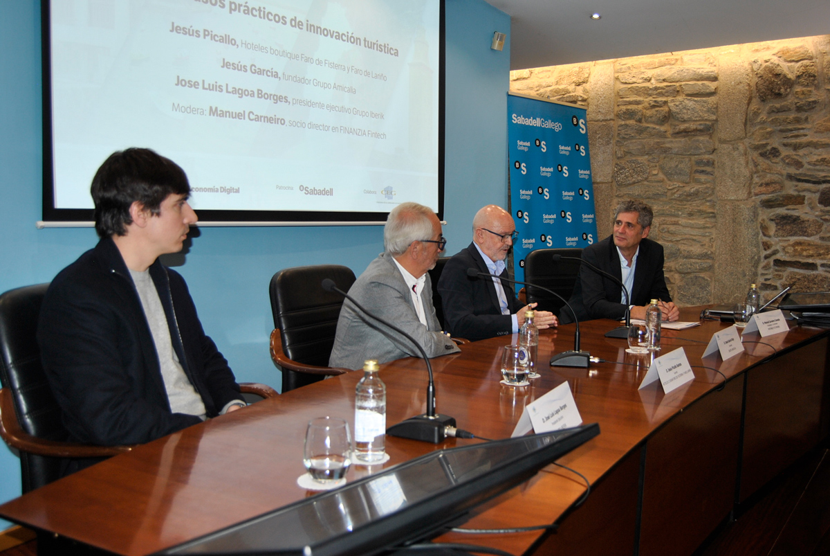 Los integrantes de la segunda mesa, moderada por Manuel Carneiro: de izda. a dcha. José Luis Lagoa Borges, presidente del Grupo Iberik; Jesús Picallo, gerente del Hotel O Semáforo de Fisterra; y Jesús García Rojo, Fundador del Grupo Amicalia / Pablo Ares Heres
