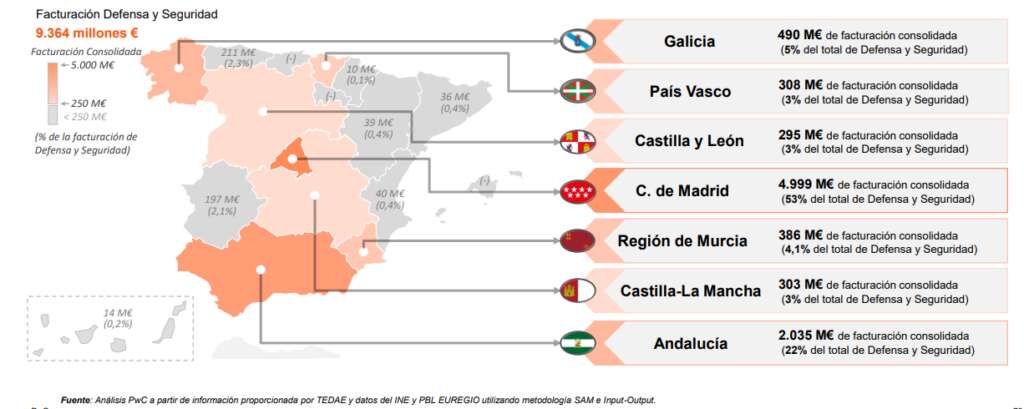El estudio analiza, en realidad, los sectores de defensa, aeronáutica y espacio, aunque es el primero el único en el que Galicia tiene un peso relevante. Según PwC, analizando las empresas asociadas a Tedae, la facturación del sector de defensa y seguridad ascendió a 9.364 millones en 2024, la mayor parte en los territorios de Madrid, con casi 5.000 millones, y Andalucía, con 2.035 millones. Galicia está en el último escalón del pódium, pues su industria de defensa habría alcanzado los 490 millones. Se sitúa por encima de Murcia, con 386 millones; o de País Vasco con 308 millones.