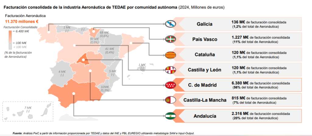En los otros dos sectores analizados por PwC, Galicia tiene menos peso. En aeronáutica, la facturación de la industria en Galicia alcanzó los 136 millones. Entre los asociados de Tedae están Airbus y Aernnova, que tiene una fábrica en Ourense. Los principales territorios por volumen de negocio son Madrid, con 6.380 millones; Andalucía, con 2.316 millones; País Vasco, con 1.227 millones; y Castilla-La Mancha, con 815 millones en 2024.