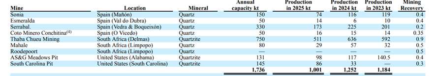 La producción de cuarzo y cuarcita también se movió a la baja en Sudáfrica, provocando una contracción total desde las 1,25 millones de toneladas registradas en 2024 hasta el millón en un 2025 que ha sido el primer año completo de la compañía desde el fallecimiento de su máximo accionista, el exministro Juan Miguel Villar Mir, que murió a los 92 años de edad en julio de 2024.