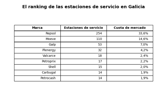 En este sentido, la cuota de mercado conjunta de Repsol, Galp y Moeve se sitúa en un 41% en el conjunto de España, lejos del 55,2% registrado en comunidades como Galicia.