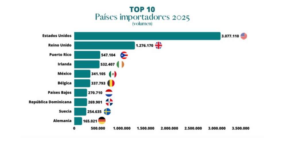 Estados Unidos se mantiene como primer mercado tras registrar un crecimiento del 5% en volumen y del 2,2% en valor pese a la imposición de unos aranceles del 15% que posteriormente serían anulados por el Tribunal Supremo, mientras que «la Unión Europea también ha experimentado un aumento significativo, liderado por Reino Unido, con un 12,05% en volumen y un 10,93% en valor»
