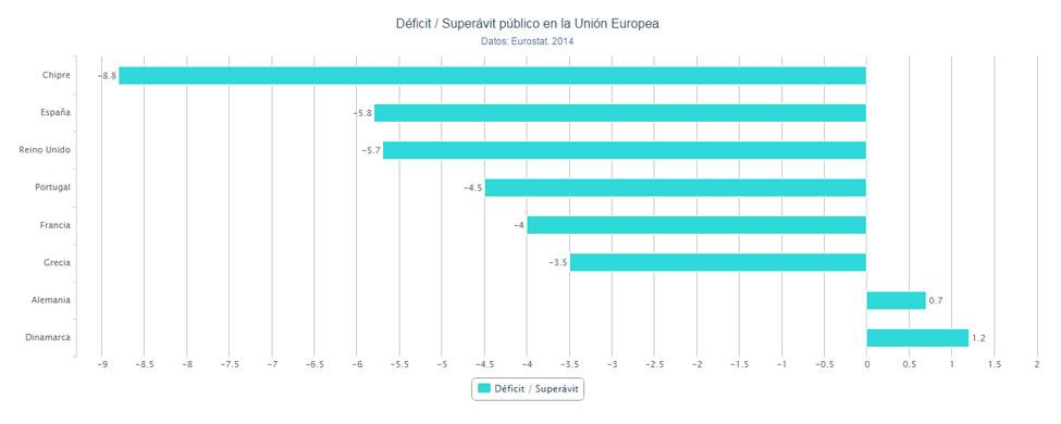 España cerró 2014 con un desvío del gasto público sobre el PIB del 5,8%, el segundo mayor de la Unión Europea por detrás de Chipre (8,8%). La oficina estadística comunitaria señala que el déficit se situaría en el 5,7% si no se incluyera la ayuda pública destinada a la banca, en línea a las cifras presentadas por Croacia y el Reino Unido.