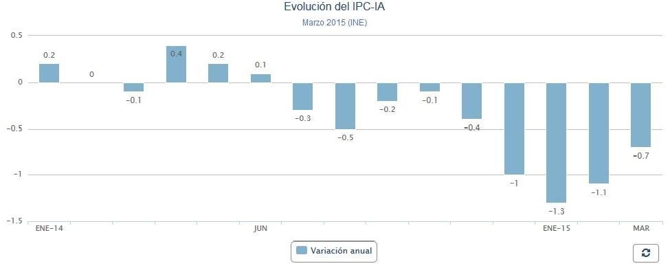 Con el dato de marzo, el IPC interanual encadena su novena tasa negativa. Es la undécima vez en 18 meses en que los precios muestran tasas interanuales negativas. En cualquier caso, el Gobierno ha descartado que la economía se encuentre en una situación de deflación estructural.