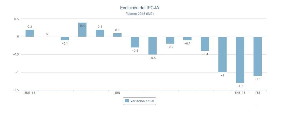 Los precios de consumo en España han bajado por octavo mes consecutivo en febrero. El IPC avanzado este viernes por el Instituto Nacional de Estadística (INE) muestra un descenso del del 1,1% en tasa interanual.