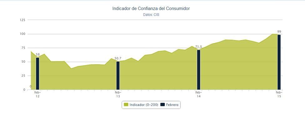 El Índice de Confianza del Consumidor recoge mensualmente la valoración de las expectativas de los consumidores españoles relacionadas con la economía de las familias y el empleo. El indicador recoge valores de entre 0 y 200, considerándose que por encima de 100 las perspectivas son positivas y, por debajo, negativas.