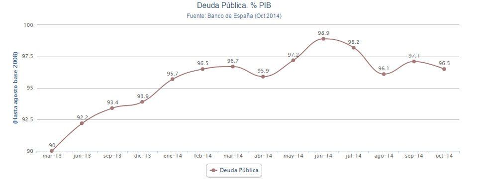 En octubre de 2013 la deuda pública crecía el 6,17% con 59.129 millones de euros más. La deuda del sector público ha bajado el mismo mes de este año después de que los dos meses anteriores se hayan registrado incrementos. El endeudamiento de las administraciones se aleja así del objetivo para todo 2014, que se situá en el 97,6% del PIB.