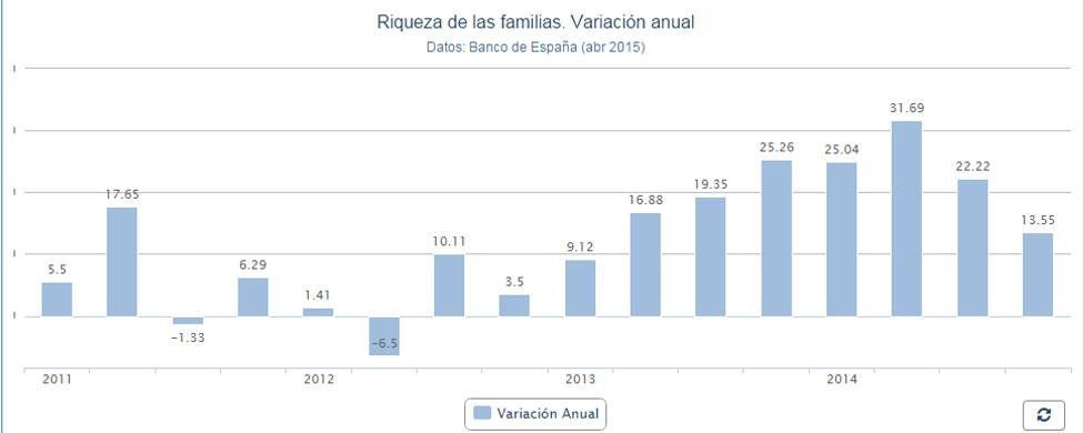 La riqueza de las familias españolas aumentó el 13,5% en 2014 y alcanzó los 1.170.889 millones de euros, según los últimos datos revisados del Banco de España. Aun así, en el cuarto trimestre del pasado año, esta riqueza se redujo el 0,53% respecto al trimestre precedente, lo que supone el primer descenso trimestral desde finales de 2012.