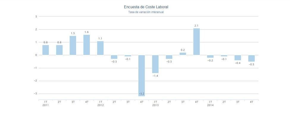 Las retribuciones de las empresas a los trabajadores registran el cuarto trimestre en negativo en España. El coste laboral medio por empleado, que incluye el salario y las cotizaciones sociales, se situó en 2.638,8 euros entre octubre y diciembre, el 0,5% menos que el mismo periodo de 2013. Si se analizan sólo los sueldos (en metálico y especie), la caída es menor, el 0,2%.