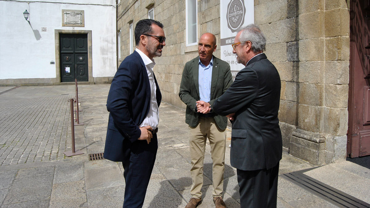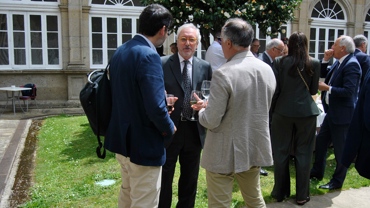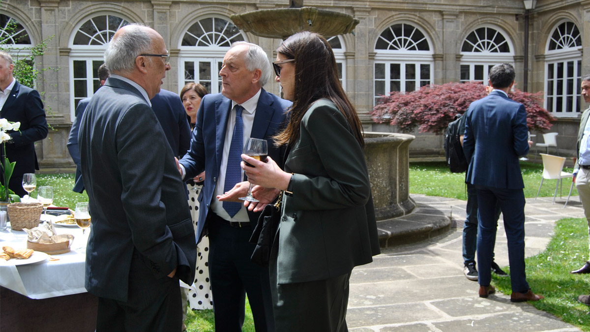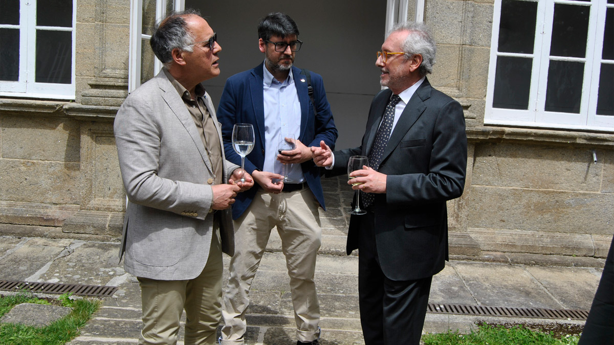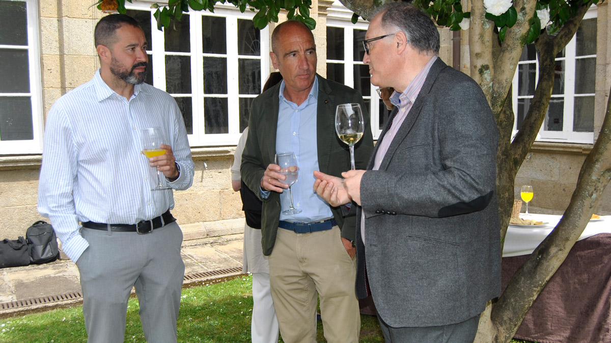 Virgilio Costas, director de desarrollo del Atlas Gallego de la Empresa Comprometida, a la derecha, charla con Rubén Rodríguez (centro) y Javier García Casto, periodistas de Economía Digital Galicia / Pablo Ares Heres