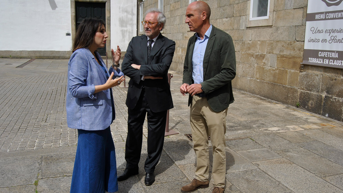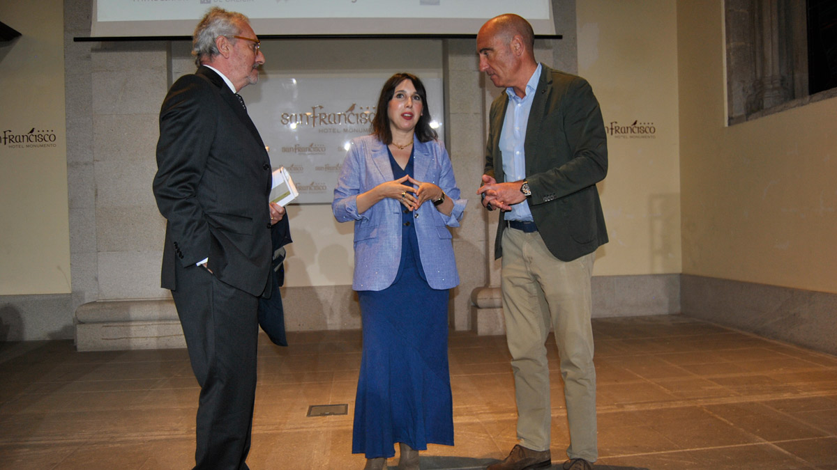 La conselleira Lorenzana junto al catedrático y expresidente de la Xunta Fernando González Laxe y a Juan García antes de comenzar el acto / Pablo Ares Heres