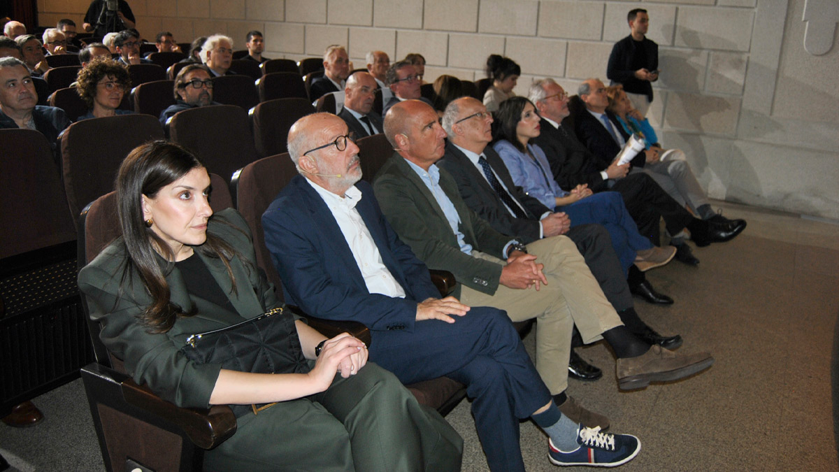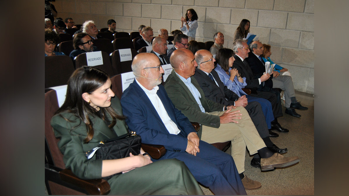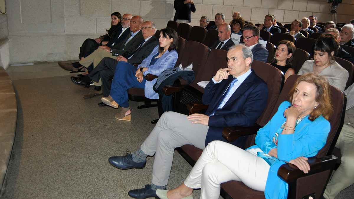 De derecha a izquierda, en primera fila, la periodista Cristina Díaz Pardo, la profesora de la USC María Bastida y el empresario Javier Garrido Valenzuela, presidente de Aproin / Pablo Ares Heres