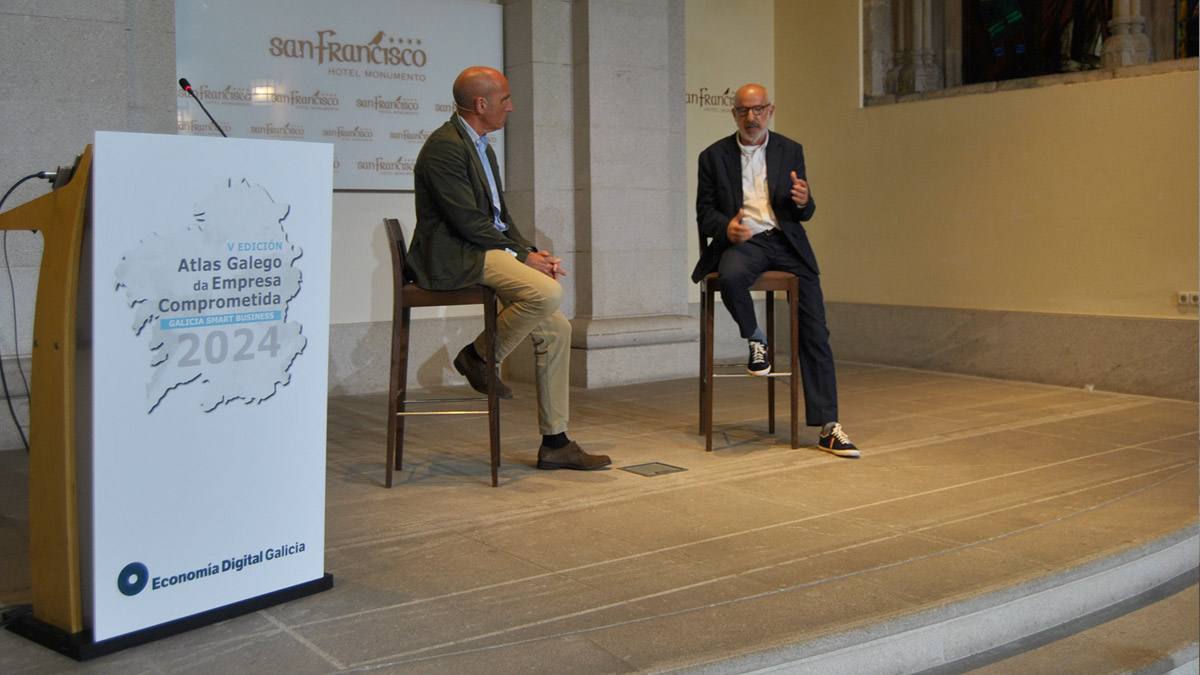 Diálogo entre Julián Rodríguez, director de Economía Digital Galicia, y Antonio Álvarez, director de Sostenibilidad de Profand y ex director de Sostenibilidad Ambiental de Inditex / Pablo Ares Heres
