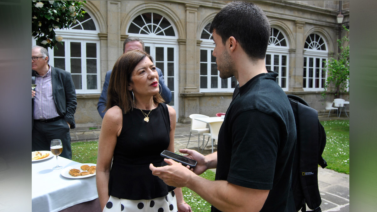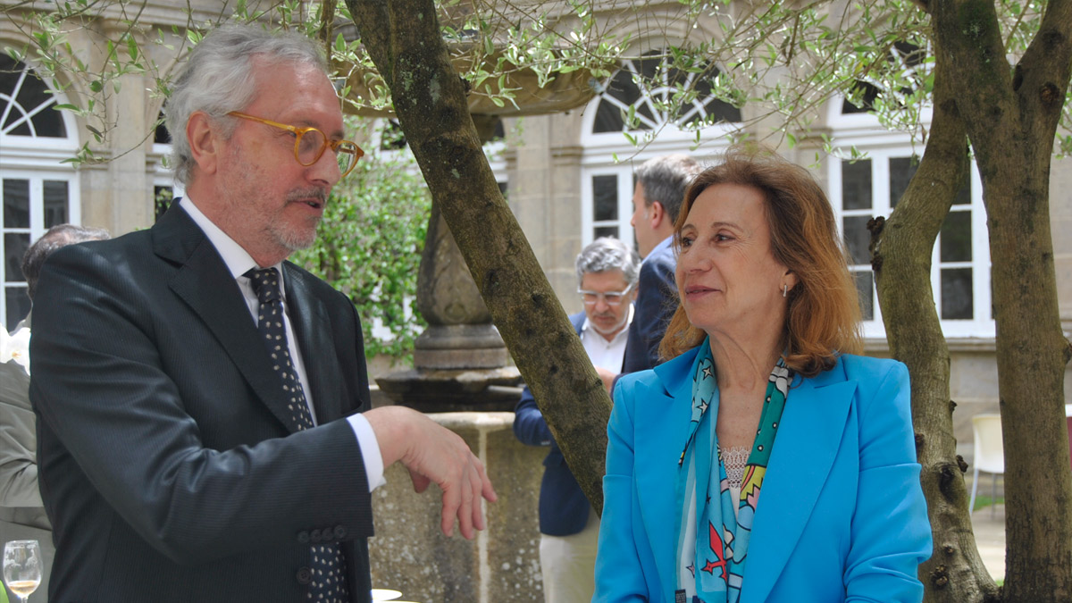 María Bastida, profesora de Organización de Empresas de la USC, dialoga con Julián Rodríguez tras la presentación / Pablo Ares Heres