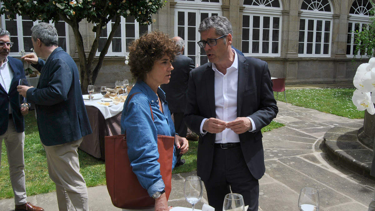 Rosa Pontes y Virgilio Costas, de Táctica y Estrategia de Comunicación, charlan animadamente con Lois Caeiro / Pablo Ares Heres