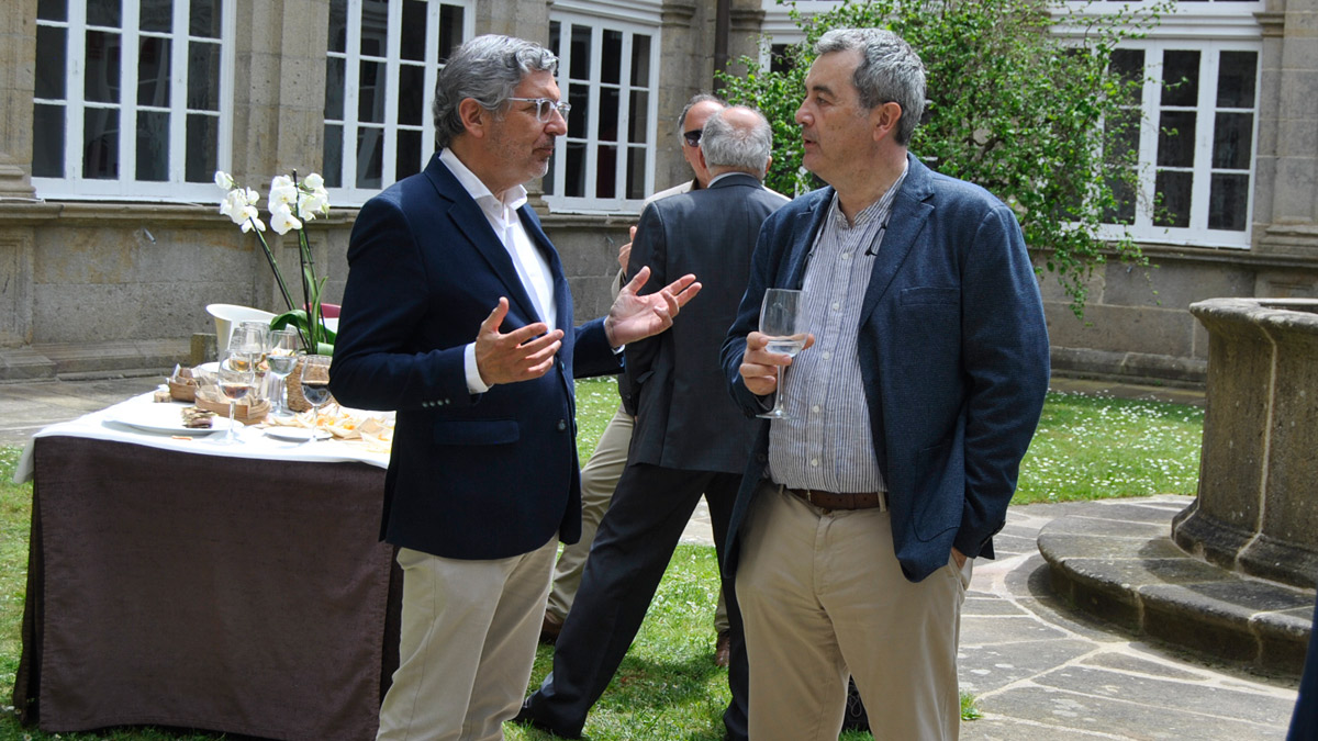 Miguel Vázquez Taín, decano del Consello Galego de Colexios de Economistas, a la derecha, charla con José Manuel Vilariño, de Abanca / Pablo Ares Heres