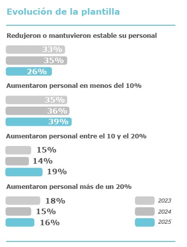 El grupo más numeroso continúa siendo el de las empresas que aumentaron el personal en menos de un 10%, que alcanza el 39% de los ochenta grupos analizados y que se prestaron voluntariamente al escrutinio, seguido de las compañías que mantuvieron estable o redujeron su plantilla. Por su parte, el conjunto de empresas que incrementaron el empleo por encima del 10% se sitúa en el 35%, una cifra superior a la registrada en 2024.