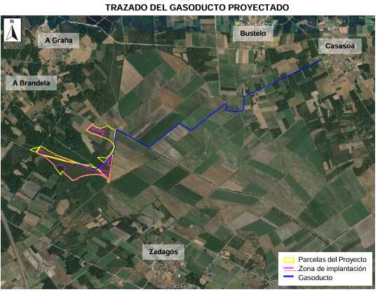 Para a inxección na rede do gas producido na planta, Ence construirá un ramal de conexión co gasoduto de Nedgia, filial de Naturgy, que discorre polo entorno de Casasoá, ao noroeste do proxecto. A compañía necesitará un gasoduto de 4,12 quilómetros, con tubaxes de seis polgadas de diámetro que irán soterradas por “camiños rodeados de parcelas agrarias, salvo o seu tramo final”, onde o tubo “discorre encaixado entre unha masa forestal”.