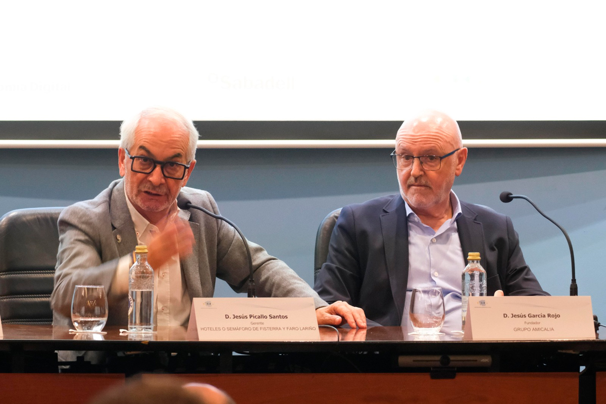 Os integrantes da segunda mesa, moderada por Manuel Carneiro: de izda. a dcha. José Luis Lagoa Borges, presidente do Grupo Iberik; Jesús Picallo, xerente do Hotel Ou Semáforo de Fisterra; e Jesús García Rojo, Fundador do Grupo Amicalia / Pablo Ares Heres