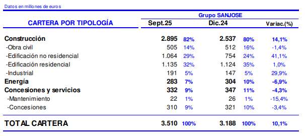 O informe de resultados de San José correspondente ao terceiro trimestre recolle que o 82% da carteira está no negocio de construción, con 2.895 millóns; fronte aos 283 millóns da área enerxética e os 332 millóns de concesións e servizos.
