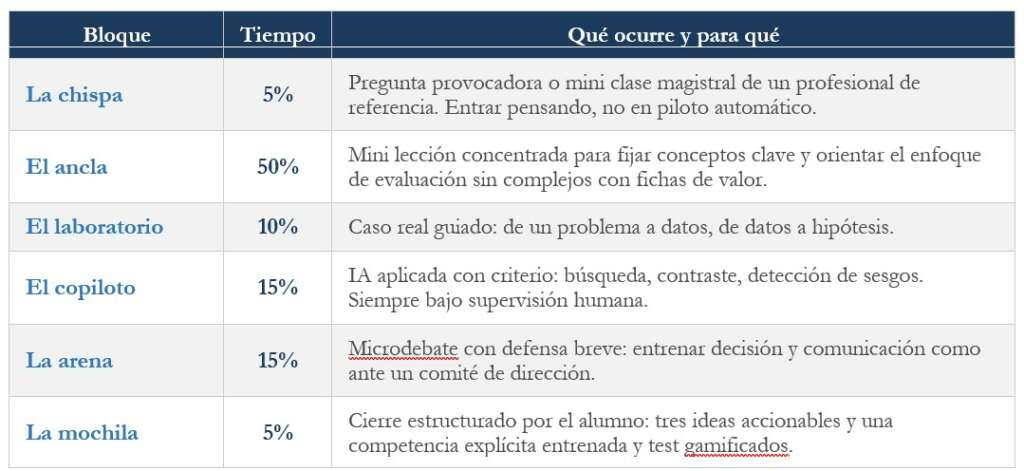 Cada sesión estrutúrase en seis bloques con proporcións deliberadas. Cada bloque ten un nome, un propósito e un peso temporal pensado para maximizar a transferencia do aprendido.