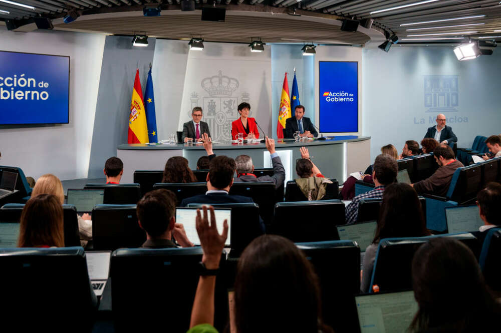 La ministra de Inclusión, Seguridad Social y Migraciones, Elma Saiz, el ministro de la Presidencia, Justicia y Relaciones con las Cortes, Félix Bolaños, y el ministro de Transportes y Movilidad Sostenible, Óscar Puente, durante la rueda de prensa tras el consejo de Ministros. Matias Chiofalo / Europa Press
