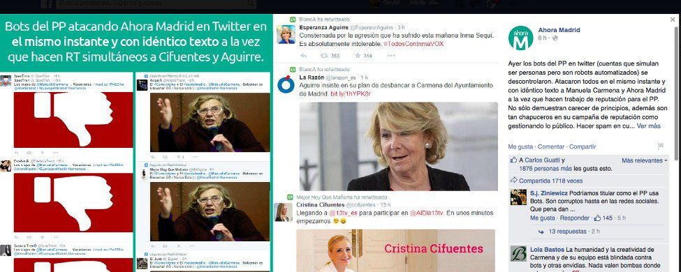 El equipo de Ahora Madrid ha delatado este miércoles a un grupo de bots (perfiles automatizados en las redes sociales) que fingen ser personas con cuentas de Twitter para atacar a Manuela Carmena y retuitear los mensajes de Esperanza Aguirre y Cristina Cifuentes.
