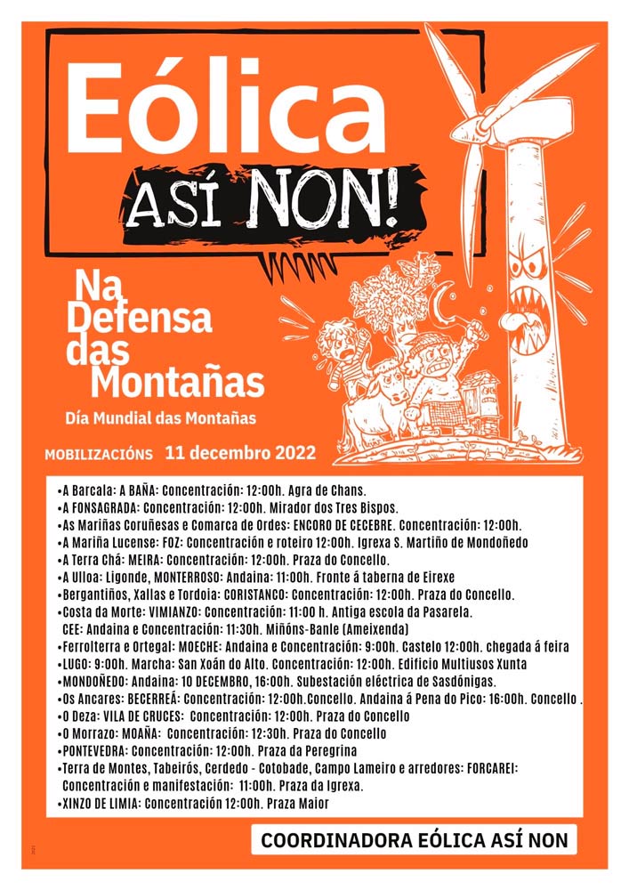 La Coordinadora Eólica Así Non, integrada por más de 200 colectivos gallegos, han convocado para este domingo concentraciones y manifestaciones en 19 localidades de Galicia con motivo del Día Mundial de las Montañas para reclamar un «modelo eólico alternativo». Bajo el lema ‘Defendamos as montañas. Eólica Así Non. Temos Alternativa’, las movilizaciones se completarán, el algunos casos, con marchas o subidas a la cúspide de montañas afectadas.