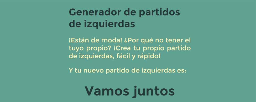 Tu propio partido de izquierdas, a un solo click. Así de rápido y sencillo. Esto es lo que propone el Generador de partidos de izquierdas, un portal que crea instantáneamente nombres para posibles candidaturas ciudadanas y parodia la división de siglas que, a falta de pocas semanas para el 20D, existe en el espectro político a la izquierda del PSOE.