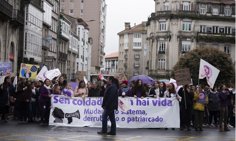 Las marchas han tenido lugar este mediodía y a las 19:30 horas de este domingo y en ella organizaciones asistentes como Galegas 8M han encabezado las protestas de Santiago de Compostela exhibiendo el lema ‘sin cuidados no hay vida’ para visibilizar el rol de la mujer a la hora de hacerse cargo de hijos, nietos y personas con depedencia.