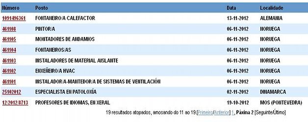 A pesar de ser el principal servicio de la Xunta para desempleados, el listado de ofertas de trabajo se actualiza con lentitud y son escasos los puestos para trabajar en Galicia. Durante un mes, entre el 19 de octubre al 19 de noviembre, se incorporaron 11 ofertas de empleo. Seis hacían referencia a puestos de trabajo en Noruega, una era para trabajar en Alemania y otra en Dinamarca. En cuanto a posibles vacantes en Galicia, sólo se publicitó un puesto de peluquero para O Pino (A Coruña), otro como profesor de idiomas en Mos (Pontevedra) y, por último, un puesto de monitor deportivo para Xinzo de Limia (Ourense).