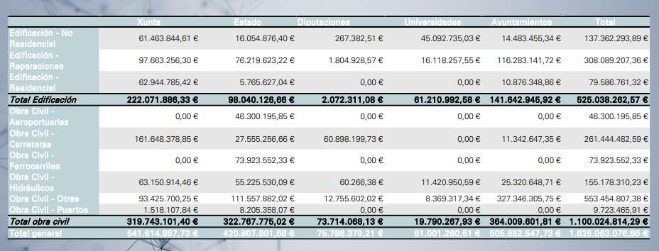 En el área de edificación, las reparaciones y la obra no residencial, en todo caso, recibieron más recursos que la obra residencial, con 308 millones y 137,3 millones respectivamente. La obra civil alcanzó los 1.100 millones, con 261 millones destinados a carreteras y 155 millones a obras hidráulicas.