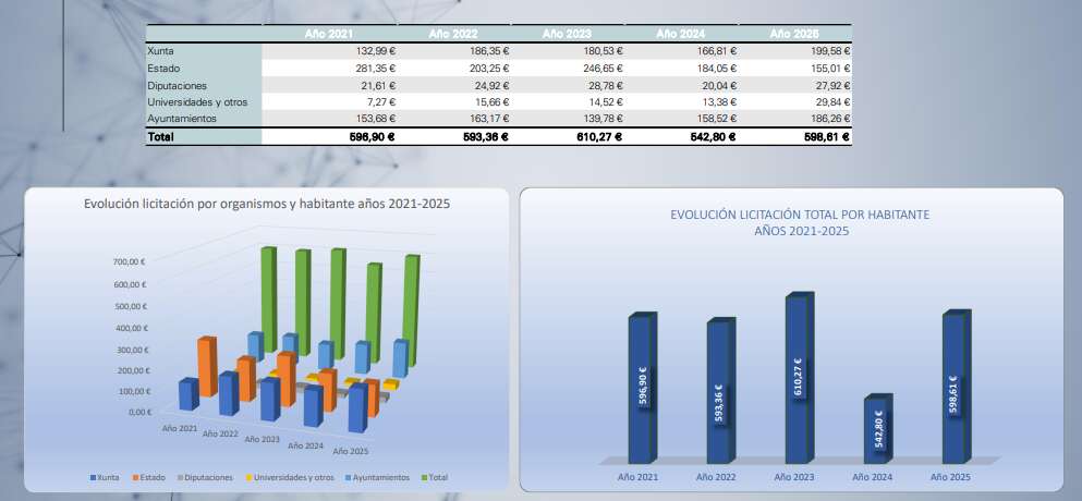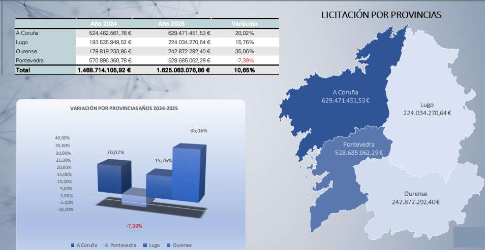 Por provincias, A Coruña es la que concentró el mayor volumen licitado y Ourense, donde más creció. La nota disonante la puso Pontevedra, único territorio donde se registró un descenso, al bajar desde los 570,8 millones de 2024 a los 528,6 millones el año pasado. Esto facilitó el cambio de liderazgo en obra pública, pues A Coruña alcanzó los 629,4 millones licitados.