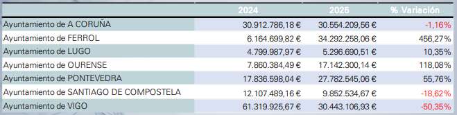 En cuanto a las siete ciudades gallegas, fue el Concello de Ferrol el de mayor volumen licitado, con 34,2 millones y un crecimiento del 456% respecto al ejercicio anterior. Este incremento está vinculado a los proyectos de la Ciudad del Deporte y Abrir Ferrol ao Mar. La evolución contraria siguieron A Coruña, Santiago y Vigo, donde la licitación de obra pública de los ayuntamientos cayó.