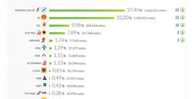 Panorama incierto tras los comicios de Portugal. Portugal à Frente, el partido conservador del actual primer ministro, Pedro Passos Coelho, ha repetido victoria en las generales. Sin embargo, esta vez se ha quedado lejos de la mayoría absoluta, con un 37,4% de los votos sobre el 95% de las papeletas escrutadas. El economista puede presumir de haber evitado al país luso convertirse en una nueva Grecia, pero ha sido duramente criticado por su política de recortes al dictado de la troika.