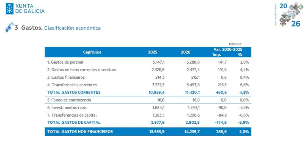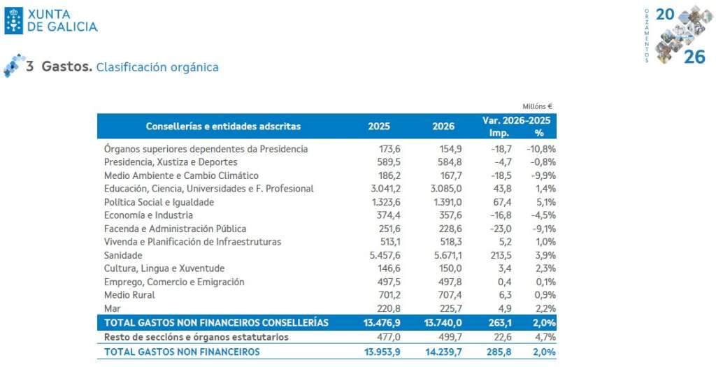 Los presupuestos de la Xunta para 2026 no solo definen la arquitectura de prioridades y, en gran medida, de compromisos, que tendrá el Gobierno gallego el próximo año, donde tres consellerías (Sanidade, Política Social y Educación) se llevan algo más de siete de cada diez euros de gasto no financiero. En esa línea, el crecimiento es de casi un punto sobre lo marcado en los presupuestos en ejecución, lo que refuerza también esa idea de relevancia sobre las actuaciones en otros ámbitos, en los que quizá las limitaciones propias de las competencias transferidas no son tan claras. Eso pesa.