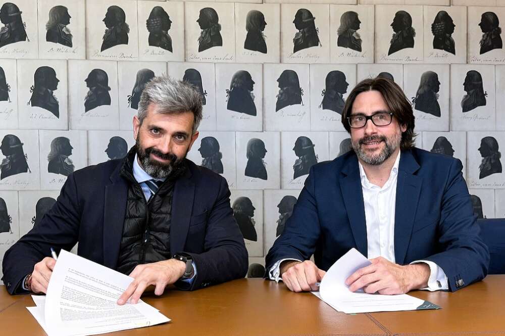 Emilio Bruquetas, consejero delegado de Recursos de Galicia, firma la compra del parque eólico Mondigo con Xavier Gásquez, managing director de Sinia Renovables, participada del Sabadell. Foto: Recursos de Galicia