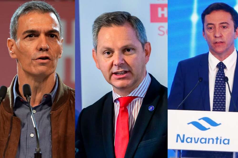 Pedro Sánchez, presidente del Gobierno, al lado de dos imágenes de los presidentes de las empresas públicas Mercasa, José Miñones, y Navantia, Ricardo Domínguez- Fotos archivo: Europa Press y Navantia