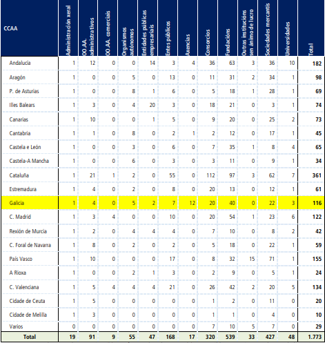 El organismo fiscalizador analiza las principales magnitudes de las entidades instrumentales de la Xunta agrupadas en agencias, organismos autonómicos (exceptuando el Sergas), entidades públicas empresariales, sociedades mercantiles, fundaciones y consorcios, sin detallar el balance individual de cada uno de los entes. Respecto a los 2.309 millones de recursos gestionados, destaca que el 52% corresponde a las agencias, debido al peso de la Axencia Galega de Infraestruturas, con 507 millones; la Amtega (Axencia para a Modernización Tecnolóxica de Galica) con 161 millones; y la Axencia de Turismo de Galicia, con 115 millones. También tienen un peso relevante las sociedades mercantiles por los recursos que concentran Sogama y la CRTVG (CSAG).