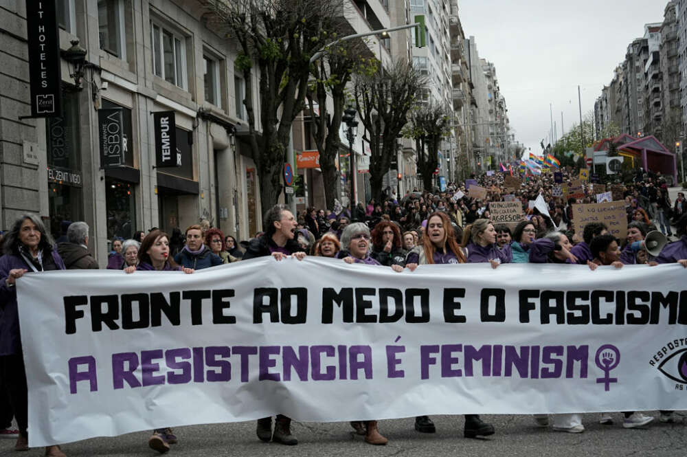 Una gran pancarta, predecida por un mantón de ‘patchwork’, de la plataforma viguesa Resposta Feminista -una de las entidades adscritas a esta convocatoria unitaria- lidera la protesta con la consigna ‘Fronte ao medo e o fascismo, a resistencia é feminista’. Al mismo tiempo, se escuchan cánticos como: «Se tocan a unha, tócannos a todas», «Imos desertar as tarefas do fogar» y «Nin guerra que nos mate nin xuíz que nos oprima».
